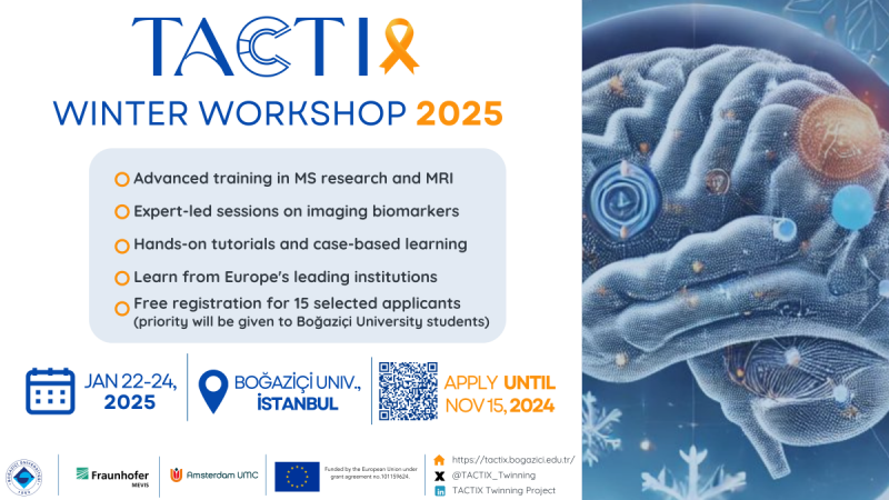 We are pleased to invite you to apply for the first in a series of three winter workshops focused on clinical and technical concepts related to multiple sclerosis (MS) research. This workshop series is organized under the EU-funded Twinning Action project, TACTIX, in which Boğaziçi University coordinates a consortium with partners from Amsterdam University Medical Center (AUMC) in the Netherlands and Fraunhofer MEVIS in Germany. The workshop is a three-day event, accommodating around 15 participants, and is free registration , including light refreshments.