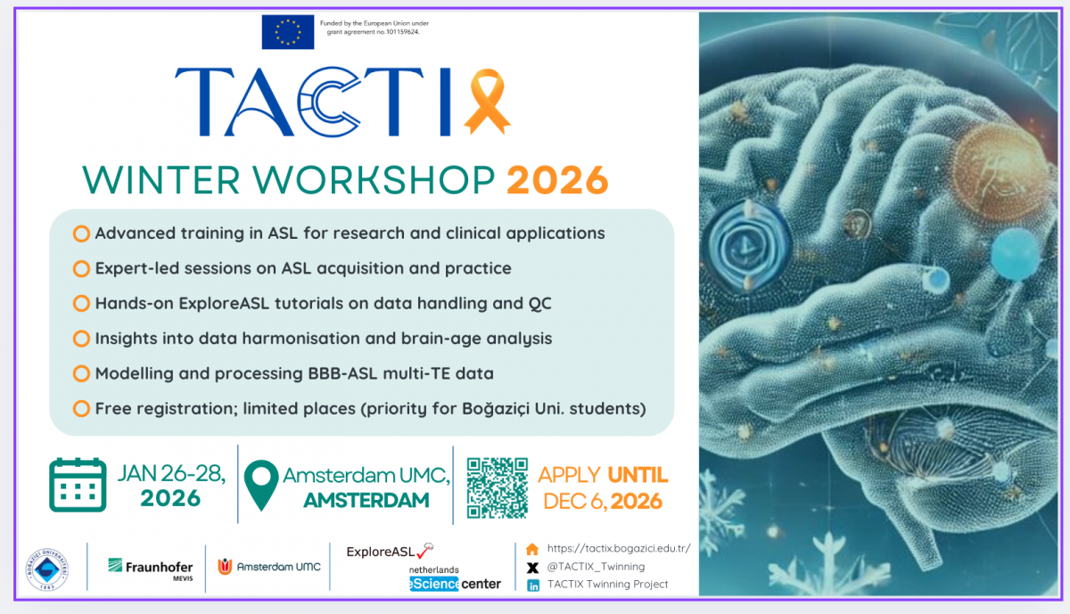 We are pleased to invite you to apply for the second in a series of three winter workshops focused on clinical and technical concepts related to multiple sclerosis (MS) research. This workshop series is organized under the EU-funded Twinning project, "Twinning Approach for Computational MRI Technology and Innovation Excellence in Türkiye" (TACTIX), in which Boğaziçi University coordinates a consortium with partners from Amsterdam University Medical Center (AUMC) in the Netherlands and Fraunhofer MEVIS in Germany. The workshop is a three-day event, accommodating 20 participants, with free registration, including light refreshments.